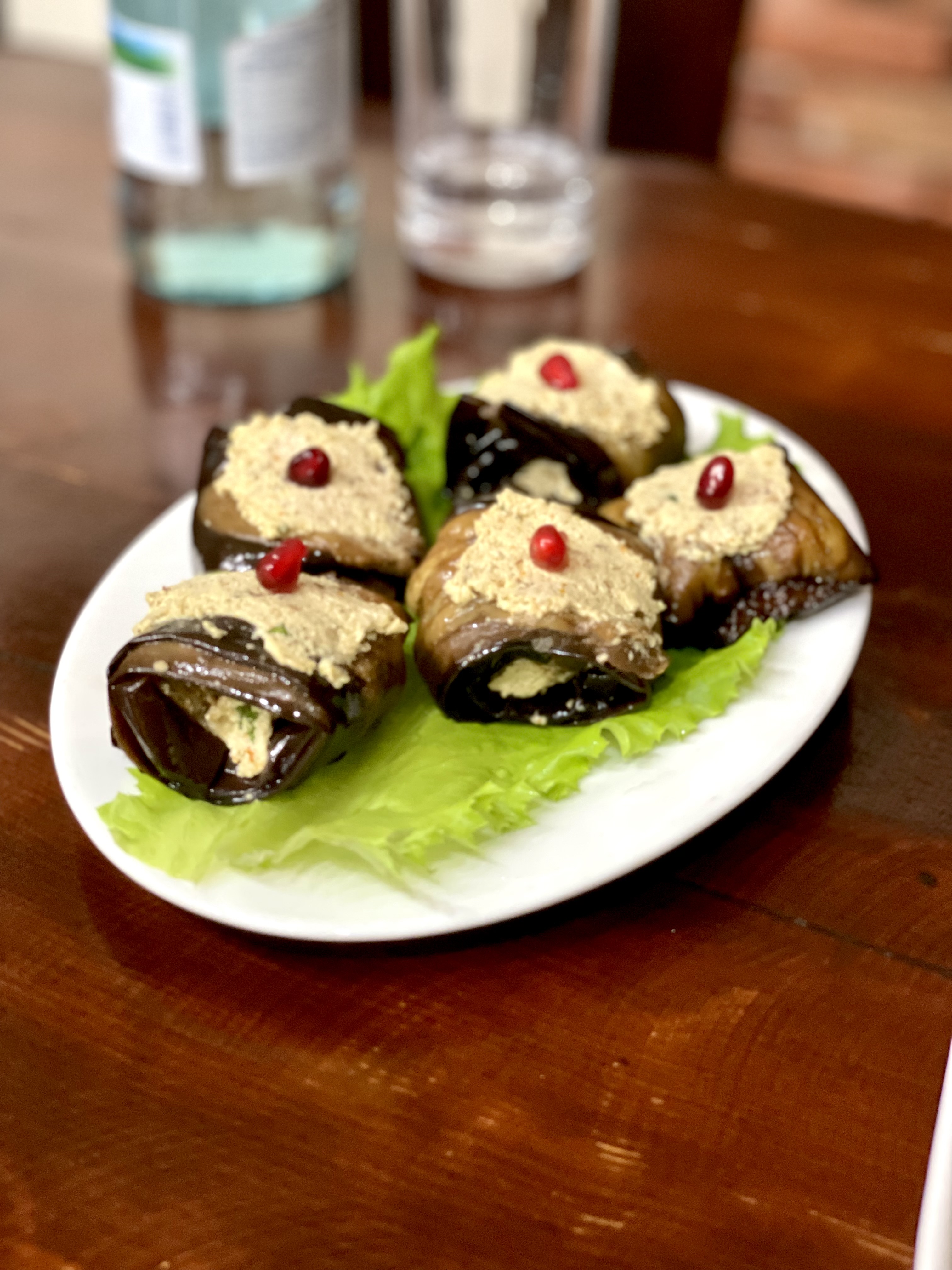 - Badrijani Nigvzit: Eggplant slices rolled and filled with a walnut paste mixed with garlic, spices, and herbs. (I’m not usually a fan of eggplant, but this dish was surprisingly good—soft, flavorful, and delicious. However, it’s quite a caloric bomb, so one or two pieces per person are more than enough.)
