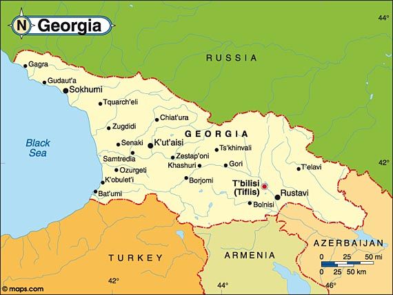 - Georgia shares its BORDERS with four countries: Russia to the north, Azerbaijan to the southeast, Armenia to the south, and Turkey to the southwest.