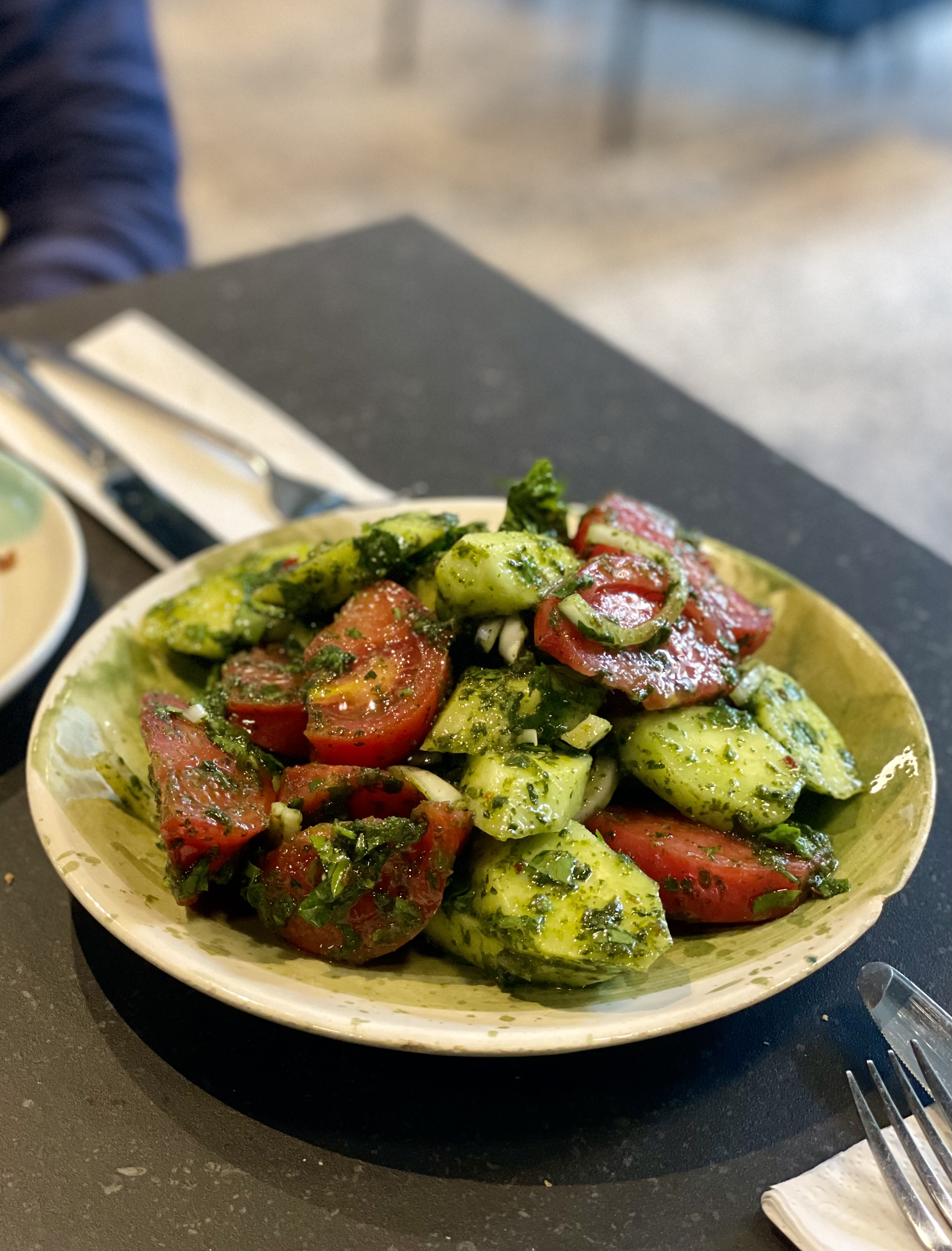 - Kartuli Salata: It’s a fresh and vibrant dish featuring seasonal vegetables, herbs, and often a walnut dressing (tomato, cucumber, onion, cilantro, parsley). This is one you’ll end up eating every day. It’s fresh, tasty, colorful, and the perfect starter for lunch or dinner. The tomatoes are incredibly flavorful, the cucumbers perfectly chilled, and the herbs work their magic.