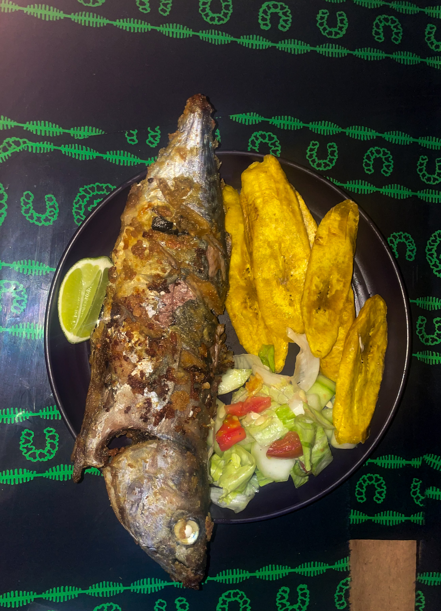 Breakfast consists of a single fried egg, served alongside two lightly fried, subtly sweet breads, a slice of watermelon, and a piece of pineapple. For both lunch and dinner, the menu remains unchanged: fish accompanied by simple side dishes, which vary between plantains or rice. Occasionally, chicken is offered as an alternative to fish, but this is the extent of the culinary options available.
